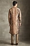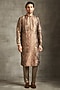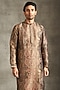 Featuring a beige kurta in brocade base with thread embroidery. It is paired with pyjama pants. Style it with mojaris for a festive occasion, wedding or engagement ceremony.