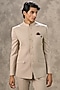 Featuring a brown jodhpuri in blended rayon base. It is paired with pants and a pocket square. Style it with pair of mojaris and a bracelet for a festive occasion, reception, engagement or wedding ceremony.
