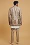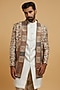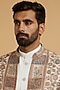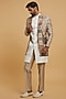 Featuring a cream indowestern jacket in art silk base with self-design. It is paired with a kurta and pants. Style it with classic mojaris for a wedding, sangeet or engagement ceremony, exuding charm and elegance.