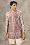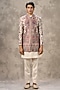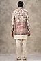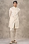 Featuring a cream indowestern in art silk base with thread embroidery. It is paired with a kurta and pants. Style it with mojaris for a reception, wedding, sangeet or engagement ceremony.
