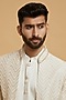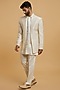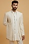 Featuring a cream indowestern in blended rayon base with embroidery. It is paired with a kurta and pants. Style it with classic mojaris for a wedding, sangeet or engagement ceremony, exuding charm and elegance.