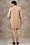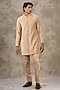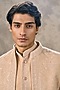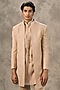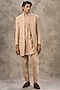 Featuring a fawn-colored indowestern in velvet base with thread embroidery. It is paired with a kurta and pants. Style it with pair of mojaris and malas for a wedding, sangeet or engagement ceremony.
