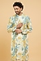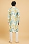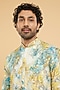 Featuring a turquoise blue-yellow kurta in art silk base with print, zardosi hand embroidery. It is paired with churidar pants. Elevate this kurta set with kolhapuri sandals for a festive occasion, daytime pooja or intimate wedding rituals.