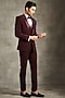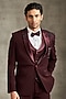 Featuring a wine blazer in blended rayon base with stone, beadwork and thread embroidery. It is paired with pants, a waistcoat, shirt, pocket square and a bow. Style it with pair of shoes for a festive occasion, reception, cocktail or engagement ceremony.
