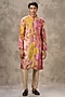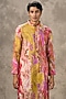 Featuring a yellow kurta in art silk base with print and sequins work. It is paired with churidar. Style it with mojaris for a festive occasion, cultural event, haldi or engagement ceremony.