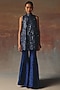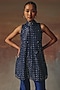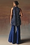 Twenty Nine features a blue A-line top in soft net base with halter neck, beads and mirror work. Accentuate with flared pants, silver dangler earrings, a statement clutch and block heels for festive occasions, sangeet or pre-wedding ceremony.