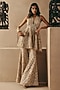 Featuring a golden peplum top in net base with v-neck backless and mirror hand embroidery. Accentuate it with pants, zirconia or swarovski jewellery, embellished heels and a clutch for a wedding or engagement ceremony.