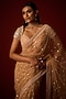 Featuring a golden saree in net base with mirror embellishment and beaded tassels detail. It is paired with a structured blouse having crystal lace detailing, beads, sequins and mirror embellishment, including an underskirt having satin box pleat detail. Accentuate it with polki earrings, soft curls and heels for festive occasions or pre-wedding ceremonies.