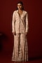 Featuring ivory blush sharara in tulle base with mirror and bead work. Accentuate it with an embroidered kurta, dangler earrings and block heels for a graceful look, perfect for festive occasions, pooja ceremonies or daytime celebrations.
