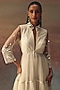 Twenty Nine features an ivory layered backless anarkali jacket in soft net base with mirror embellishments. Accentuate with flared pants, silver dangler earrings, a statement clutch and block heels for festive occasions, sangeet or pre-wedding ceremony.