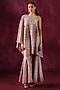 Featuring lilac bootcut pants in lace fabric base with mirror work. Accentuate it with a jacket, statement earrings and heels for an evening look.
