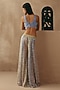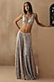 Featuring multi-colored sharara pants in net base with mirror work. It is paired with a sleeveless embroidered blouse and a slip on jacket having crystal and tassels detail. Style it with meenakari or zircon jewellery, metallic heels and and a potli bag, perfect for a cocktail, sangeet, or engagement ceremonies.