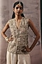 Featuring a natural-colored gilet in net base with mirror and beads work. Style it with flared pants, zircon stud earrings and metallic high heels for a a cocktail, sangeet or evening soirees.