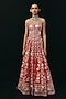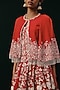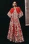 Featuring a red lehenga in crepe silk base with mirror and beads work. It is paired with corset blouse and a cape jacket having beads embroidery. Style it with meenakari or zircon jewellery, metallic heels and and a clutch bag, perfect for a cocktail, sangeet, or engagement ceremonies.