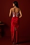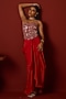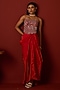 Featuring a red pickup skirt in moonga silk base. Style it with an embroidered blouse or corset top, along with statement jewellery and block heels for a cocktail look, perfect for festive parties, sangeet nights or evening events.