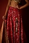 Featuring a ruby red lehenga in patola base with tassel detailing. It is paired with a gold tissue blouse having zari embellishment and tassel detailing, including a banarasi bandhani rani pink dupatta having tassel detailing. Accentuate it with traditional gold jewellery, an embellished potli and block heels for a regal look, perfect for weddings or an engagement ceremony