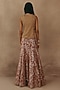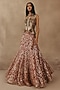 Featuring a rust fish-cut lehenga in net base with mirror work. It is paired with a golden tulle gilet and a chanderi tissue dupatta having tassels detail. Style it with meenakari or zircon jewellery, metallic heels and a clutch bag, perfect for a cocktail, sangeet, or engagement ceremonies.