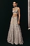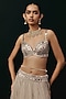 Featuring a silver lehenga in net base with ruffled hemline and mirror work. It is paired with a bralette and a bolero jacket. Style it with zircon or diamond jewellery, metallic heels and a clutch bag, perfect for a cocktail, sangeet, or engagement ceremonies.