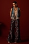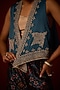 Featuring a teal asymmetrical gilet in satin silk base with marodi and bead work, including tassels detail. It is paired with a taupe shantoon bralette having mirror and beadwork, including patola flared palazzos. Accentuate it with kundan jewellery, a sleek clutch and embellished heels for a graceful look, perfect for festive occasions or daytime weddings.