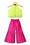 Featuring a lime green sleeveless woven top for girls in chanderi base. It is paired with pink printed palazzo pants. Accentuate it with cute hair accessories or sandals for festive celebrations or sangeet ceremony.