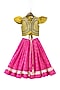 Featuring a pink lehenga for girls in polyester base with print. It is paired with a yellow embellished top. Style it with cute hair accessories and sandals for a festive occasion or wedding ceremony.