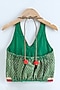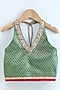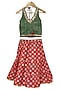 Featuring a red lehenga for girls in brocade base with print. It is paired with a green embellished top. Style it with cute hair accessories and sandals for a festive occasion or wedding ceremony.