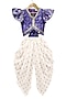 Featuring a purple woven top for girls in polyester base with embellishments. It is paired with white printed dhoti pants. Accentuate it with cute hair accessories or sandals for a festive occasion or pooja ceremony.
