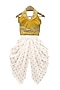 Featuring a yellow top for girls in polyester base with embroidery. It is paired with white dhoti pants having print. Accessorise it with matching hair accessories and sandals for a stylish ensemble, ideal for any evening event or any pre-wedding function.