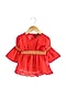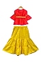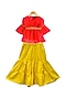 Featuring a coral kurta for girls in georgette base with print. It is paired with yellow printed sharara pants. Accessorize it with matching hair accessories and sandals for a stylish ensemble, ideal for festive occasion.