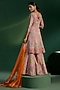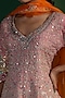 Featuring a blush pink A-line kurta in silk base with a V-neckline, multi-colored thread, mirror, zari and sequins embellishment. It is paired with flared sharara pants and an orange net dupatta having multi-colored thread embroidery. Accentuate with statement jewellery and heels for a festive occasion, sangeet or wedding functions.