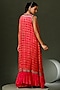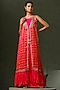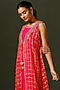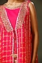 Featuring a hot pink zari woven cape in crinkle georgette base with kundan and gota machine embroidery. It is paired with a terry crepe gown. Accessorize it with dangler earrings and heels for festive look.