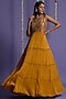 Featuring a mustard gown in crinkle chinnon base with sequins embroidery.