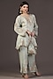 Featuring a mystic green kurta in tissue base with applique and zari hand embroidery. It is paired with pants and a potli bag. Accentuate with statement earrings and heels for a festive occasion or a pooja ceremony.