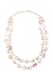 Featuring a layered necklace studded with multi-colored lemon topaz, amethyst tumbles, cubic zirconia beads and gold pearls, set in brass.