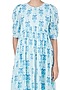 Featuring a light blue tea length dress in mul cotton base with ikat print, puffed sleeves, and side pockets.