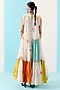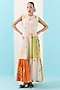 Featuring a multi-colored tiered dress in organic fabric base with aari embroidery, patchwork and ruffle detail. Accentuate it with a sling bag, block heels and hoop earrings, perfect for brunches or evening soirees.