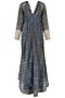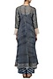 Featuring an indigo long dress in linen base cut in bias with leheria print all over the front and back along with tissue silk detailing on the sleeves hem.