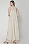 Featuring a beige sheer and flared dress in chanderi silk base with stripes. This contains only one piece.