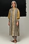 Featuring a grey and green shirt dress in handwoven tussar silk base with tie-dye. Accentuate it with statement earrings and heels for an evening look.