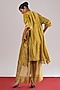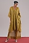 Featuring a mehendi green A-line dress in zari tussar silk and brocade silk base with a V-neckline, brocade sleeves, leheriya and shibori hand-dye detail. Accentuate it with pants, stud earrings and wedges for a festive occasion, sangeet or cultural celebrations.
