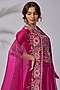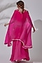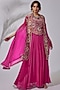 Featuring a pink cape in organza base with zardosi embroidery. It is paired with a matching embroidered chanderi silk crop top and a georgette pleated skirt.