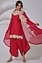Featuring a red cape in organza base with zardosi embroidery. It is paired with a matching embroidered chanderi silk short kurta and satin low crotch pant.