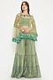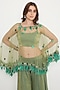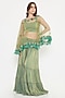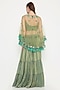 Featuring a green poncho in marble tissue, net and butter crepe base with acrylic, mirror, cutdana and sequins embellishments. It is paired with a tube top and palazzo pants. Accentuate it with silver jewellery and heels for festive celebrations or sangeet ceremony.