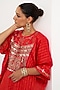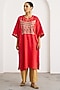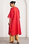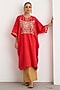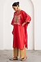 Featuring a red kaftan in silk base with handwork. It is paired with pants. Accentuate it with dangler earrings and heels for a festive look.