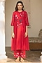 Featuring a cherry red kurta in muslin cotton base with print and embroidery. It is paired with pants. Accentuate it with statement earrings and heels for a festive ceremony.