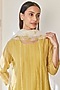 Featuring a mustard kurta in cotton muslin base with linear print and thread embroidery. It is paired with matching pants and a contrasting block printed dupatta having floral embroidery.