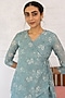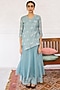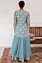 Featuring a periwinkle top in cotton chanderi base with discharge print and aari embroidery. It is paired with a matching skirt.