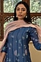 Featuring a prussian blue layered anarkali in muslin cotton with kantha embroidery and discharge print. It is paired with a contrasting blush pink scalloped dupatta.
