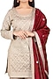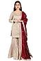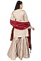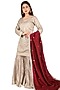 Featuring a light beige kurta in dhaka silk base with hand embroidery. It is paired with matching gharara pants and a contrasting dupatta.