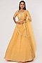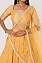 Featuring a mustard yellow lehenga in dupion silk and thin organza base with chikankari work. It is paired with a matching blouse having zardosi embroidery and an organza dupatta.
